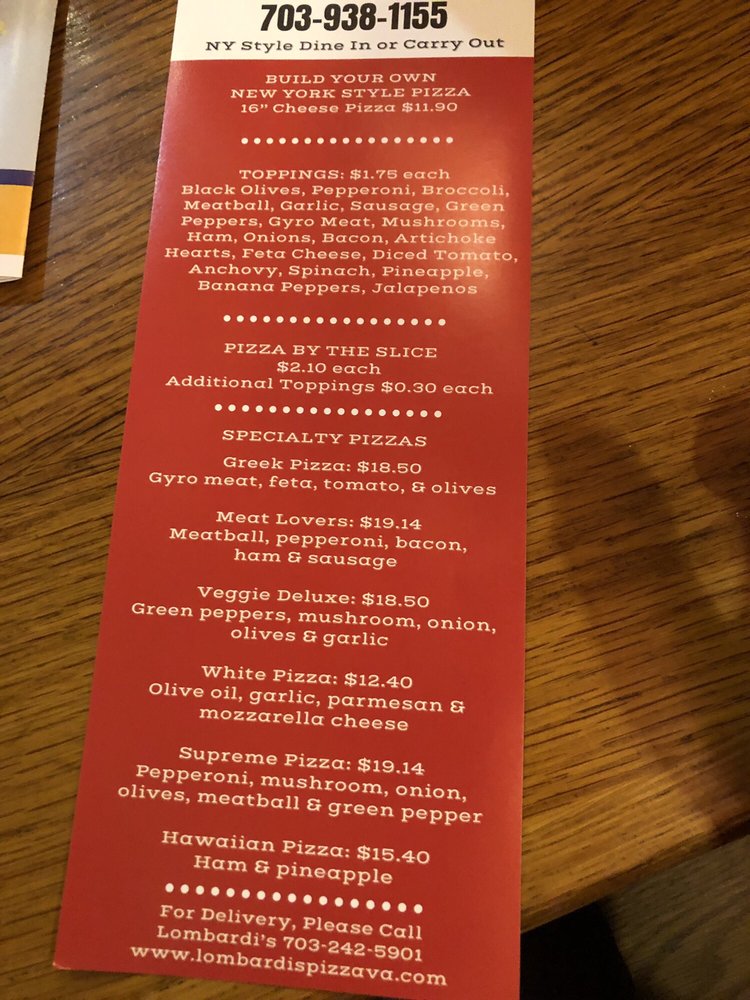 For inquiries or to place an order, don’t hesitate to call (703) 938-1155. So come on down, experience the flavors, and savor a slice at Lombardi’s today!