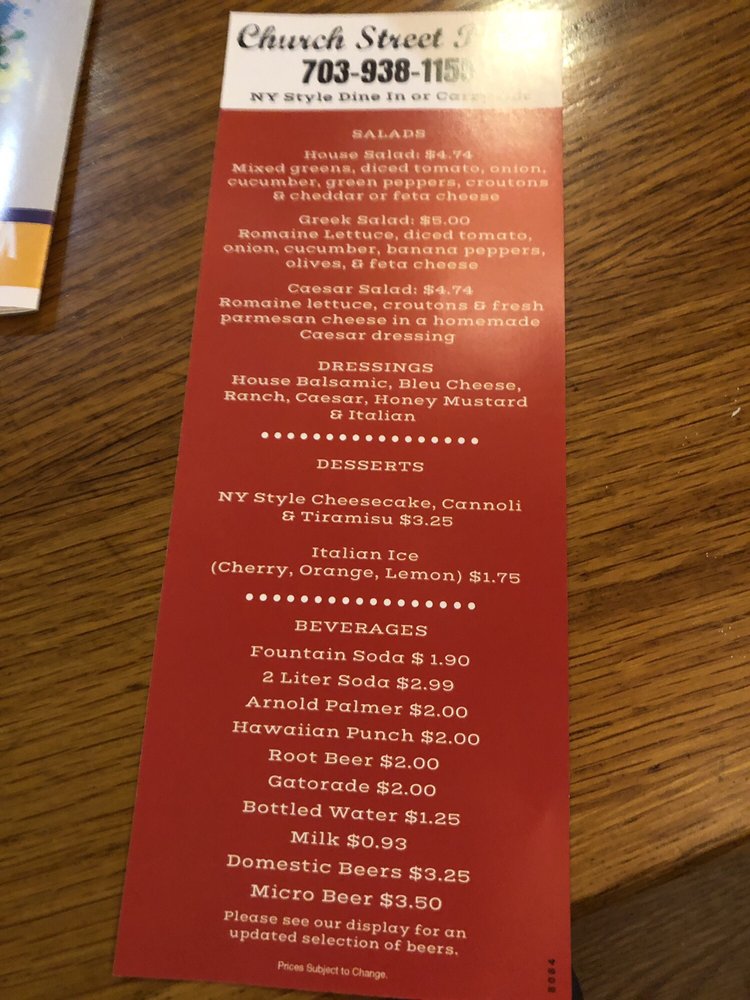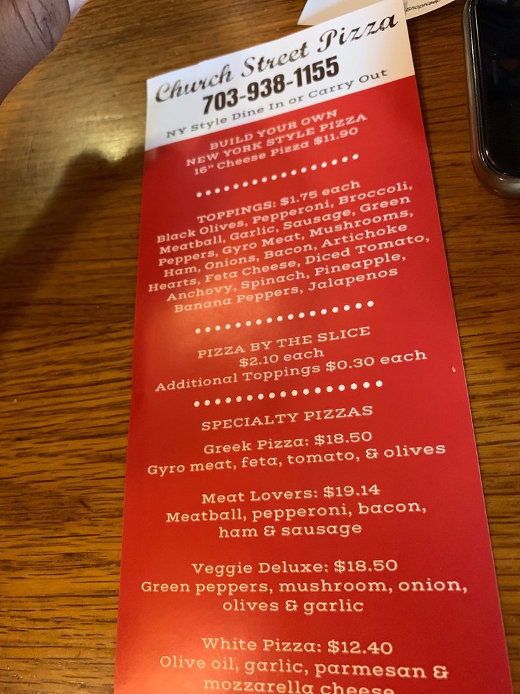 “ It's nice to have an independent pizza place that actually has quality pizza in your neighborhood. I've wanted to try Church St Pizza for awhile but did not get the chance until today. It's really good NY style pizza that reminds me of Lucianos at Tysons (RIP). I got a single pepperoni slice for a decent price. Not too greasy, cheese tasted great, crust was perfect. Very foldable which is important for me. I'm looking forward to coming back again when I'm in town. The trick is remembering that it's not actually on Church St. it's on Maple Ave. ”